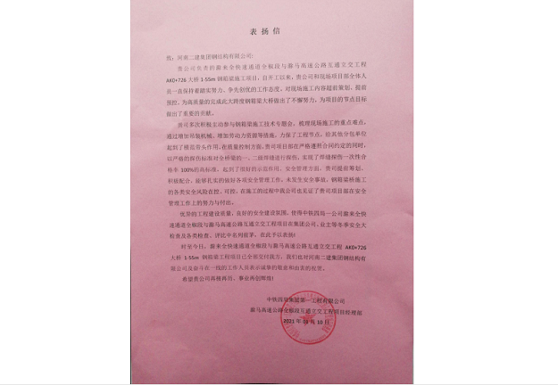 中铁四局集团第一工程有限公司向华体会(中国)发来表扬信